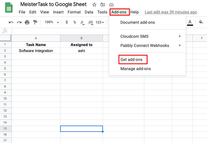 After choosing a spreadsheet that you want to integrate, click in the add-on section, and then click on the “Get add-ons” button to download the “Pabbly Connect Webhook”.