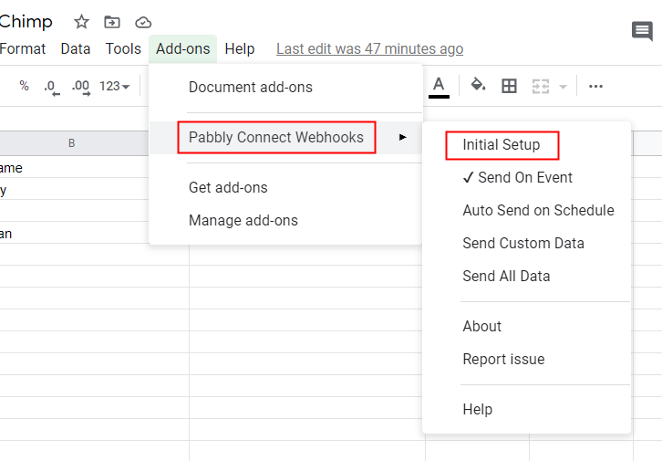 Now, when you click on add-ons, Pabbly Connect Webhook will appear there. Just click on it, it will open certain options, select “Initial Setup” to smooth the whole Google Sheets integration process.