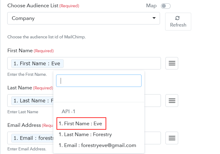 Now the app has already fetched the audience list as you see it. Just map the appropriate field from the drop-down region, such as the email field, select the email option, and select the name option for the name field.