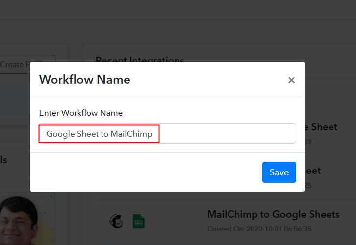 Moreover, add the name of workflow which in our case is “Google Sheets to MailChimp”. Nevertheless, you can always name the workflow according to your requirements.