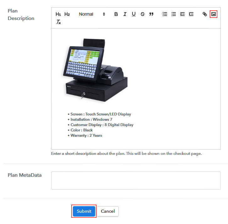 Afterward, you need to fill all the details of cash register machine such as plan name, code, price, set-up fee, and much more to continue.