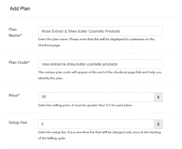 Following the previous step, you will be redirected to the page where you have to enter all the details such as plan code, setup fees, name, billing cycle, and many more.
