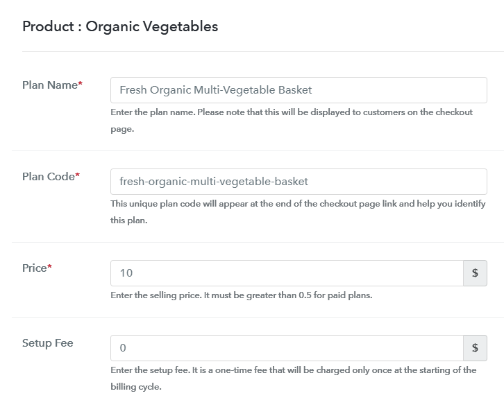 Next step is adding a plan for the created product. First, click on the “Add New Plan” button of a product and stuff out the details about the veggies that you want to sell. These plan details will be visible on the checkout page.