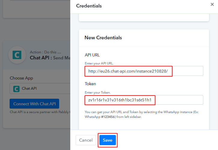 When you click on the ‘Connect’ button a window will slides in from the right asking for an API URL and token. To complete our action to send WhatsApp messages to Gravity Forms subscribers. First, log in to your Chat API account.